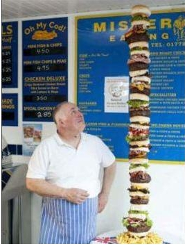日前,英國蘭開夏郡一家名為“吃貨先生的飲食廣場”(the Mister Eater's Eating Emporium)的快餐店老板約翰?克拉克森(John Clarkson)和夫人花1個半小時聯手打造了這個約1.62米高,含30000 卡路里的巨型漢堡,并用特制金屬底座將其加固,確保巨型漢堡不會崩塌。