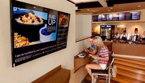 通過數(shù)字標(biāo)牌系統(tǒng)的構(gòu)建,餐廳就可以把主打菜品通過大屏幕靈活生動的展現(xiàn)出來,試問在“跟著感覺走”的點(diǎn)餐過程中,顧客怎么會對大屏幕顯示中播放的熱騰騰、香噴噴的美味佳肴視而不見呢?而且,店內(nèi)的數(shù)字標(biāo)牌網(wǎng)絡(luò)還可與時(shí)下熱門的社交媒體,如微博、微信等,打造出美食討論圈,對顧客發(fā)布的相關(guān)美食信息、餐廳評論實(shí)時(shí)追蹤、展示,讓餐廳與“微博控”、“微信控”們保持互動,從而對顧客消費(fèi)習(xí)慣進(jìn)行輿論引導(dǎo),提高菜品的推廣效率。