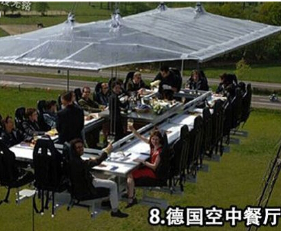 2008年8月25日,16名客人在離地50米高的“空中餐廳”享用一頓大餐。這個被叫做“空中餐廳”的項目是由一家德國探險體驗公司推出的,食客如果想要在這個被起重機懸吊起來的餐廳品嘗美味,每個人需要花費159歐元。而想試的朋友也不用跑到德國那么遠去,最近在中國的上海也已經有了這樣的“空中餐廳”了,大膽的你可以去挑戰一下了。