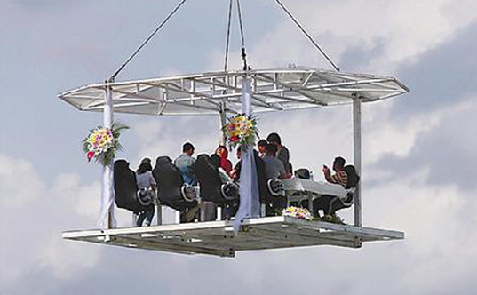 據聞,“空中餐廳”四周不設圍欄,享受餐飲服務的價格為每位8888元?吹健翱罩胁蛷d”被起重機吊著緩緩升空,不少圍觀市民嘖嘖稱奇,紛紛舉起相機、手機拍照留念,并感嘆:“這是用生命在吃飯呀!”、“這吃的不是飯,而是刺激體驗!”。
