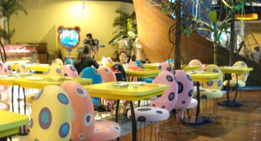 曾經(jīng)紅極一時的連鎖兒童主題餐廳“芭迪熊”在其第一家店中,讓小朋友吃飯前先進(jìn)行探險。小朋友們需要登上一條木制“帆船”,開始探險之旅:在沙灘區(qū)有“椰子樹”和花朵形餐桌;在海洋區(qū),獨(dú)一無二的水母椅子、可愛的大蘑菇飲料站都很吸引小朋友。