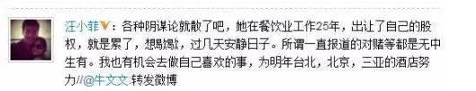 張?zhí)m其子汪小菲曾在微博上轉(zhuǎn)發(fā)《創(chuàng)業(yè)家》雜志對張?zhí)m的采訪,并說“她在餐飲工作25年,就是累了,想歇歇”。然而輿論似乎對“對賭協(xié)議”更感興趣,他的言論很快被淹沒,并沒有人相信他說了什么。