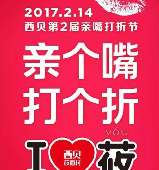 西貝2017年2月14日情人節(jié)的活動(dòng)宣傳海報(bào)主題——親個(gè)嘴,打個(gè)折。