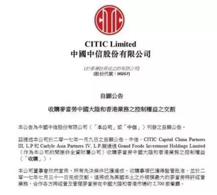根據此前麥當勞公布的協議,中信集團旗下的中信股份、中信資本控股、凱雷投資集團和麥當勞聯合宣布達成戰略合作并成立新公司,新公司將以最高20.8億美元的總對價收購麥當勞在中國內地和香港的業務。中信集團旗下中信股份和中信資本在新公司中將持有共52%的控股權,凱雷和麥當勞分別持有28%和20%的股權。