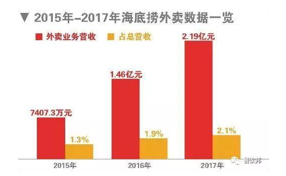 公開資料顯示,早在2010年6月,海底撈“Hi撈送”成立,成為首家推出外賣業(yè)務(wù)的火鍋餐廳,至今在國(guó)內(nèi)40余個(gè)城市推出外賣業(yè)務(wù),2017年海底撈外賣業(yè)務(wù)收入為2億元。